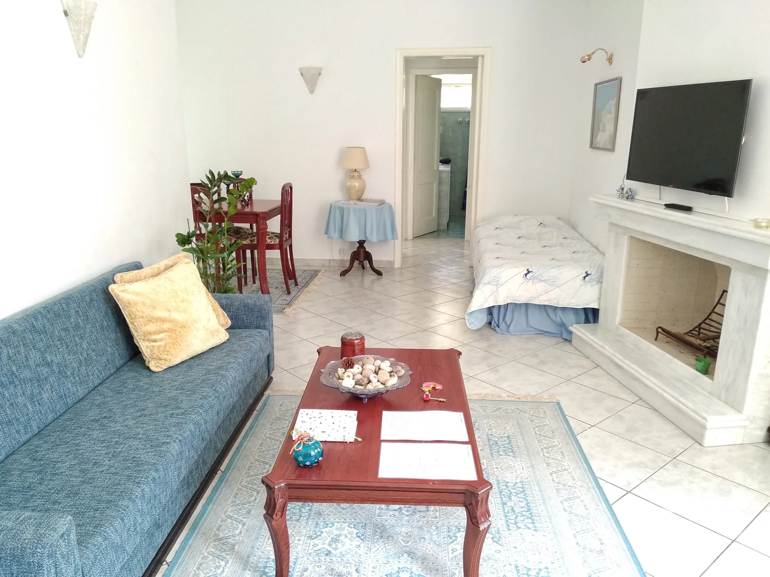 Once you are here, you will find a cozy and inviting home waiting for you. A fully equipped kitchen and a spacious living room promise to make you feel comfortable and at home. And if you’re thinking that something is missing from the picture, the fireplace in the middle of the living room will offer the extra warmth and homey feeling you need. Dine in the dining area and enjoy spending the afternoon hours in the Suite’s isolated garden, where you may listen to the cicadas and birds singing their songs on a hot summer day.